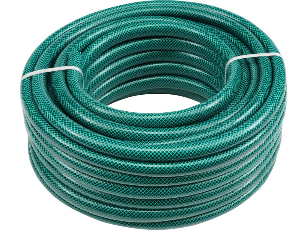 Třívrstvá zahradní hadice z pružného plastu a polyesterovým, příčným opletem. Odolná vůči stárnutí a usazování nečistot. Hadice je pružná i při nízkých teplotách.