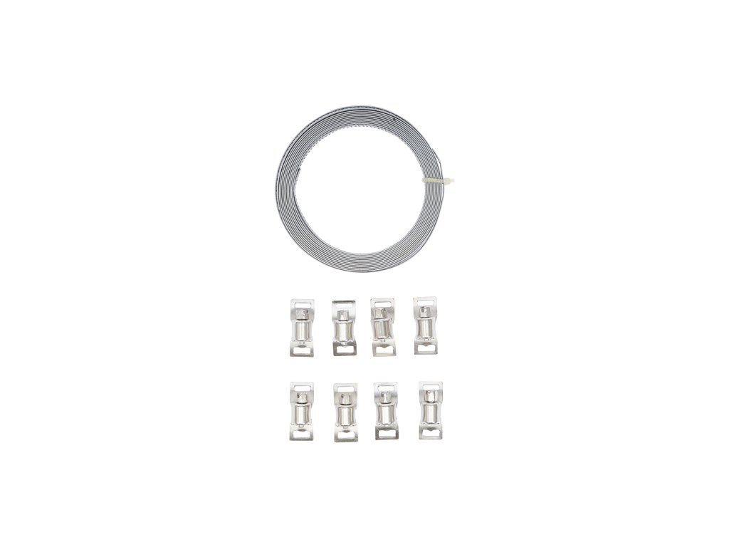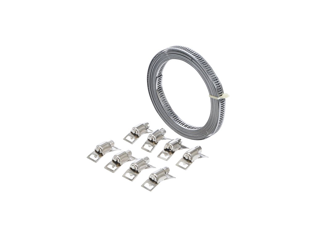 Spony na hadice s variabilními rozměry - z 3metrového pásku si uštípnete kus dlouhý podle vaší potřeby pro sponu libovolné velikosti. V sadě je také 8 kusů zámečků na šroub s plochou drážkou.