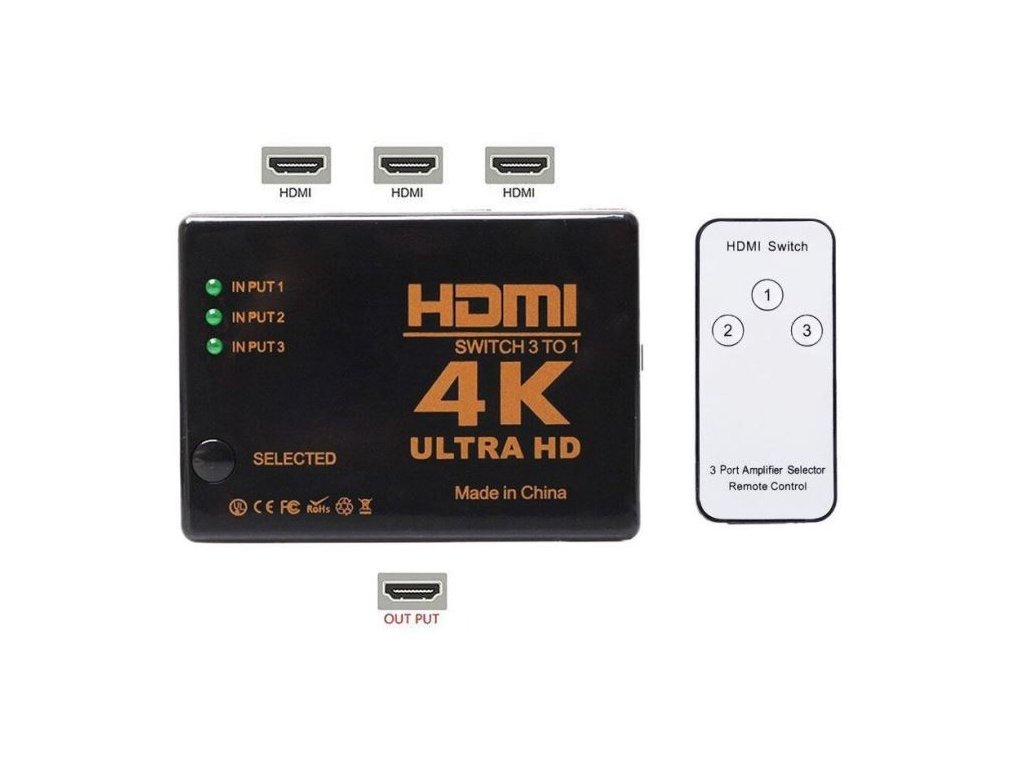 Zařízení umožňuje manuálně přepínat 3 HDMI vstupy. IR čidlo v krabičce.**Specifikace:**