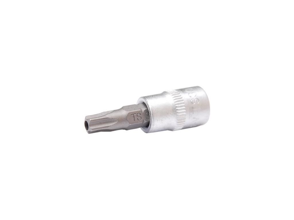 Hlavice zástrčné Torx TS, pěticípé s otvorem, matně chromované.