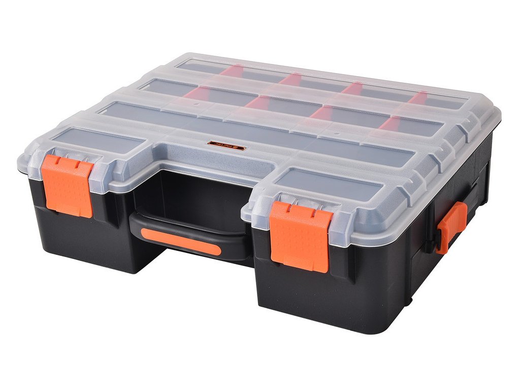 Hluboký plastový organizér s bočními šuplíky na drobný materiál jako jsou například šroubky či matice.