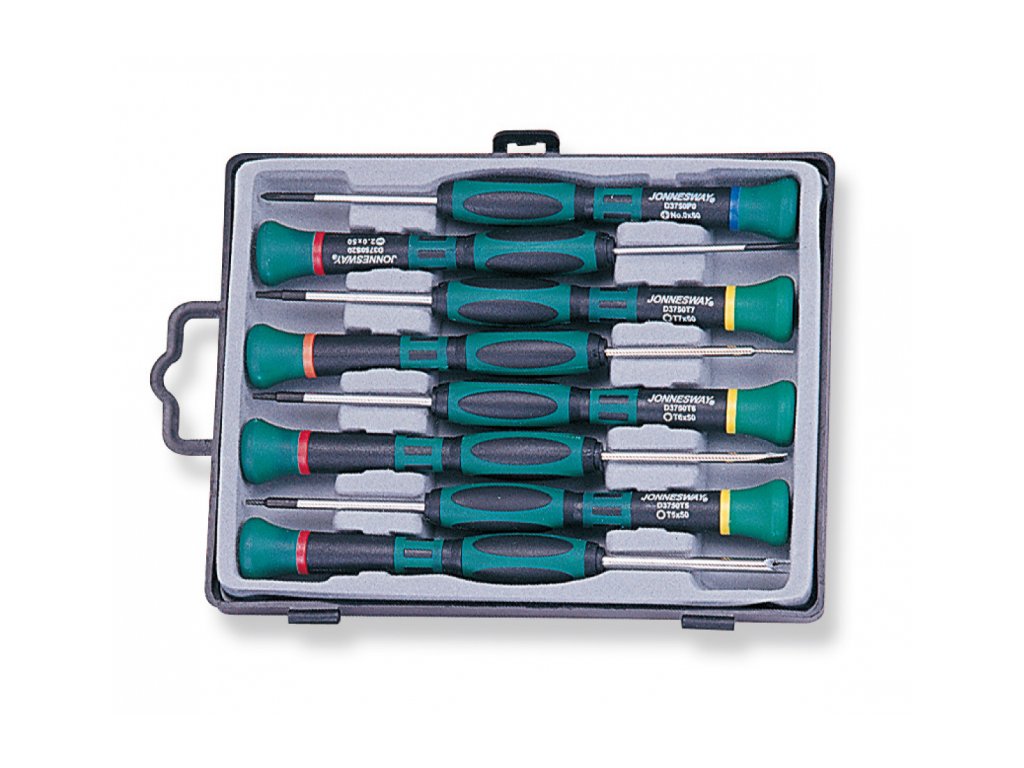 Mikrošroubováky (tzv. hodinářské či precizní šroubováky), profily křížové, TORX a speciální, sada 8 kusů v plastové krabičce – JONNESWAY D3750T18S
