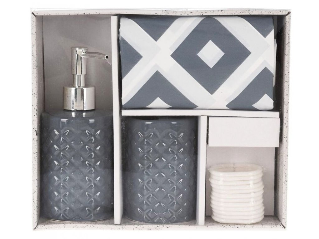 - set koupelnových doplňků v šedé barvě- vyrobené z keramiky s lesklou glazurou, závěs z PEVA- v sadě najdete také 12 háčků pro jednoduché připevnění závěsu- rozměr sprchového závěsu 180 x 180 cm- sada obsahuje 3 ks- dávkovač na mýdlo- držák na zubní kartáčky- sprchový závěs + 12 x háček na závěs- barva: šedá / bílá- značka: HomestylingDoplňkové parametry