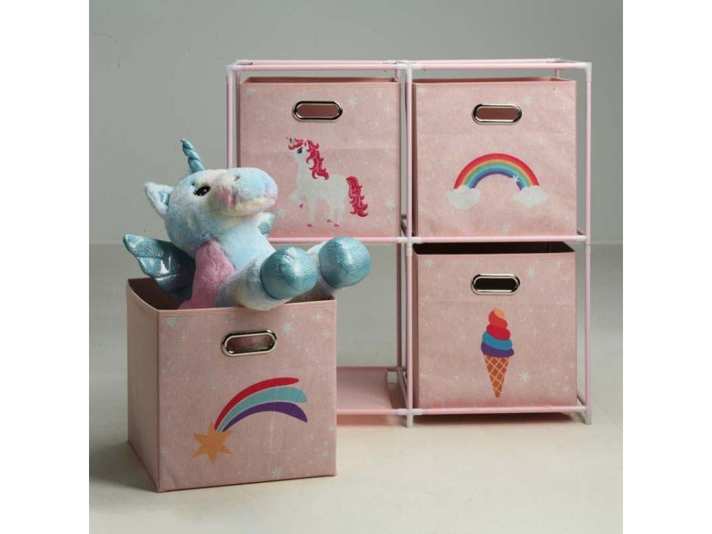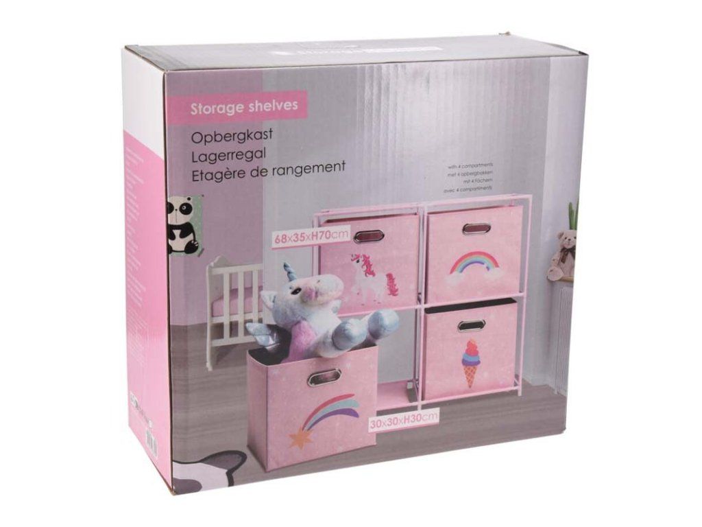 zásuvková skříňka se 4 přihrádkami, kovový rám s netkanou textilií 80gsm, růžové barevné police, rozměry: 68x35xh70cm, tloušťka trubky: 95mm, růžová barva rámu, se 4 dětskými dívčími vzory netkaných úložných boxů a kovovou rukojetí.Doplňkové parametry