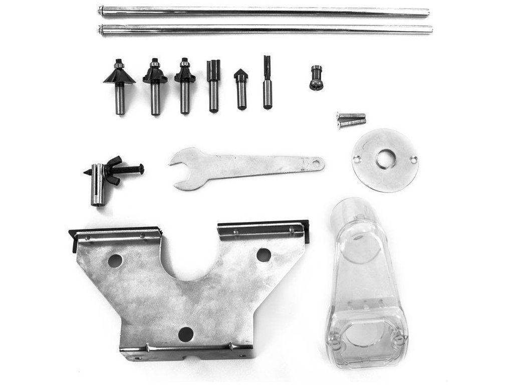 - Příslušenství: frézy (6), upínací kleštiny (průměr: 6/8 mm), podélný doraz s vodícími tyčemi, středicí kolík frézovacího kružítka, kopírovací kroužek, stranový klíč.