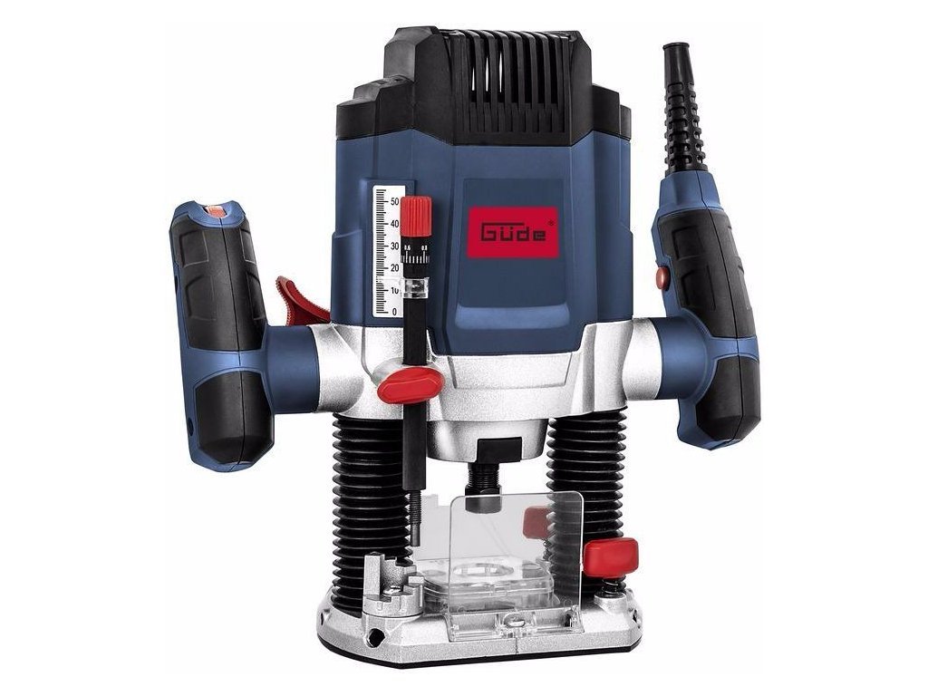 Kompaktní vrchní frézka GÜDE, určená k frézování drážek/žlábků/otvorů, profilování/falcování hran nebo kopírování z předloh/šablon v měkkém/tvrdém dřevě, dřevotřískových deskách, plastech apod.