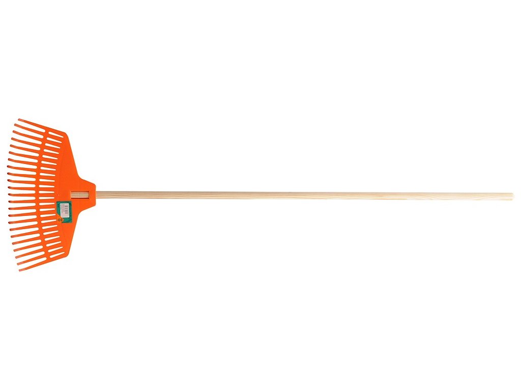 Lehký shrnovač listí vyrobený z odolného plastu a rukojetí z borovice.