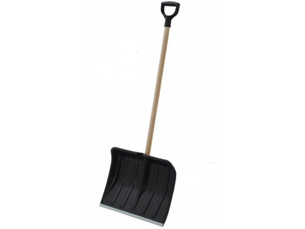 Praktický pomocník na odhrňování sněhu. Plastová lopata na sníh s lištou a dřevěnou násadou.
