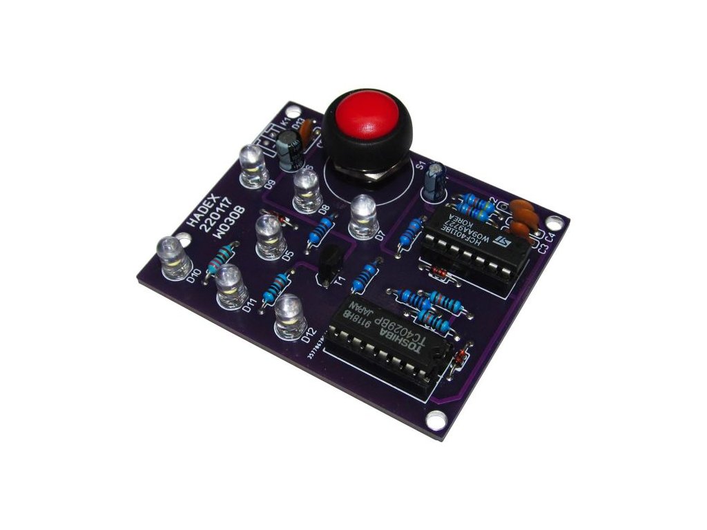 Hrací kostka elektronická bílá v.2 STAVEBNICE Po stisku tlačítka blikají v rychlém sledu LED a po uvolnění se blikání zpomaluje až do zastavení v náhodné kombinaci 1-6. Napájení: baterie 7-12V * rozměr: 65x52mm Vhodná pro začátečníky. Krabička O250 ani napájecí kontakt není součástí dodávky.Manuál k produktu je ke stažení zde