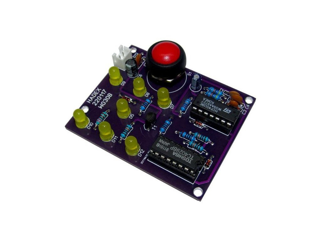 Hrací kostka elektronická žlutá v.2 STAVEBNICE Po stisku tlačítka blikají v rychlém sledu LED a po uvolnění se blikání zpomaluje až do zastavení v náhodné kombinaci 1-6. Napájení: baterie 7-12V * rozměr: 65x52mm Vhodná pro začátečníky. Krabička O250 ani napájecí kontakt není součástí dodávky.Manuál k produktu je ke stažení zde