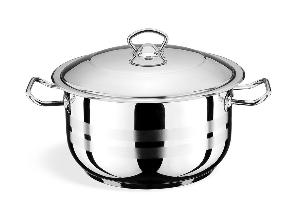 Celonerezový hrnec s pokllicí se zesíleným třívrstvým akumulačním dnem.Materiál nerezová ocel 403 18/0, rukojeti 18/10.