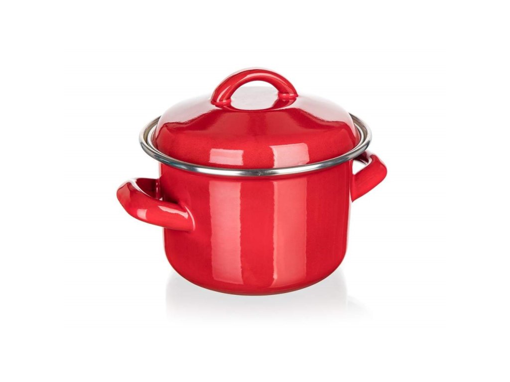 Smaltovaný hrnec MILTON 0.78 litru, rozměry: průměr 12 cm, výška (bez poklice) 8 cm, síla stěny 0.7 mm, poklice i hrnec s červenou smaltovanou glazurou, černým dnem na vnější straně, s krémovou barvou na vnitřní straně.Hrnec lze používat na všechny typy varných desek včetně indukce.