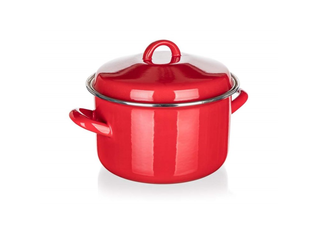 Smaltovaný hrnec MILTON 3.4 litru, rozměry: průměr 20 cm, výška (bez poklice) 12 cm, síla stěny 0.7 mm, poklice i hrnec s červenou smaltovanou glazurou, černým dnem na vnější straně, s krémovou barvou na vnitřní straně.Hrnec lze používat na všechny typy varných desek včetně indukce.