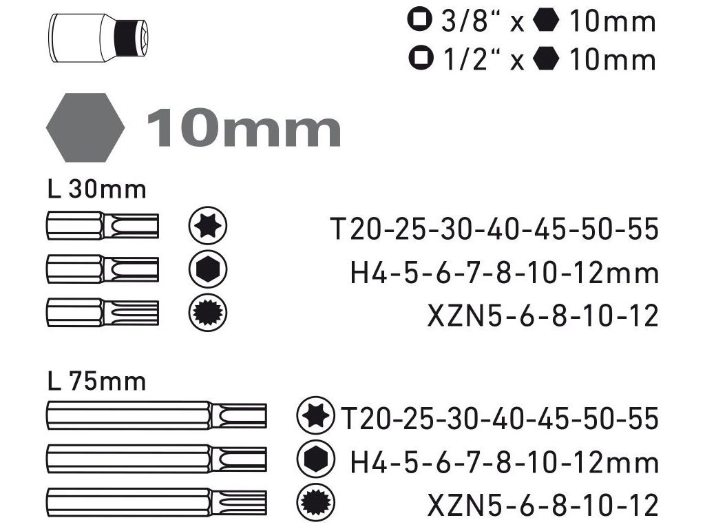 - hlavice zástrčné prodloužené: hroty zástrčné prodloužené 10mm(L75mm):T20-25-30-40-45-50-55, H4-5-6-7-8-10-12mm, XZN5-6-8-10-12