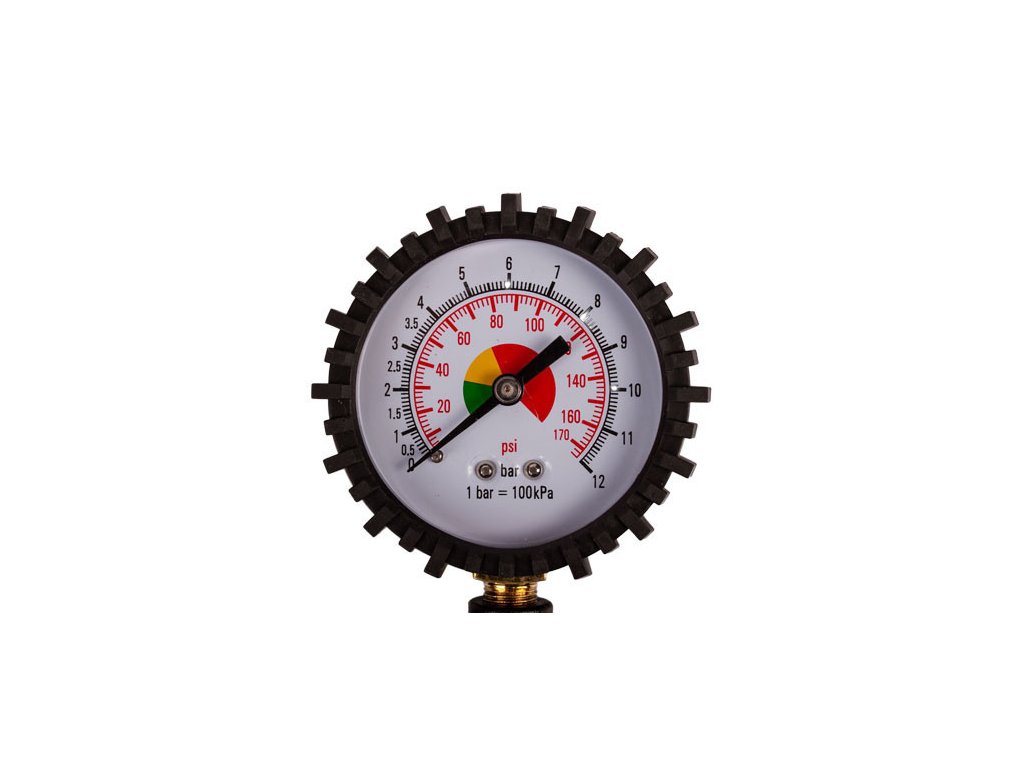 - Manometr čte hodnoty 0-12 barů a 0-170 psi