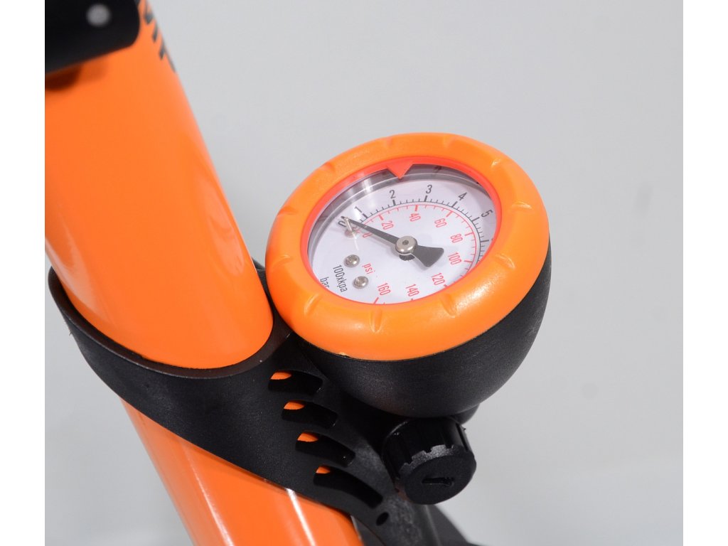 Extra výkonná ruční hustilka se zabudovaným měřičem tlaku. Je vhodná pro huštění pneumatik osobních automobilů i jízdních kol.