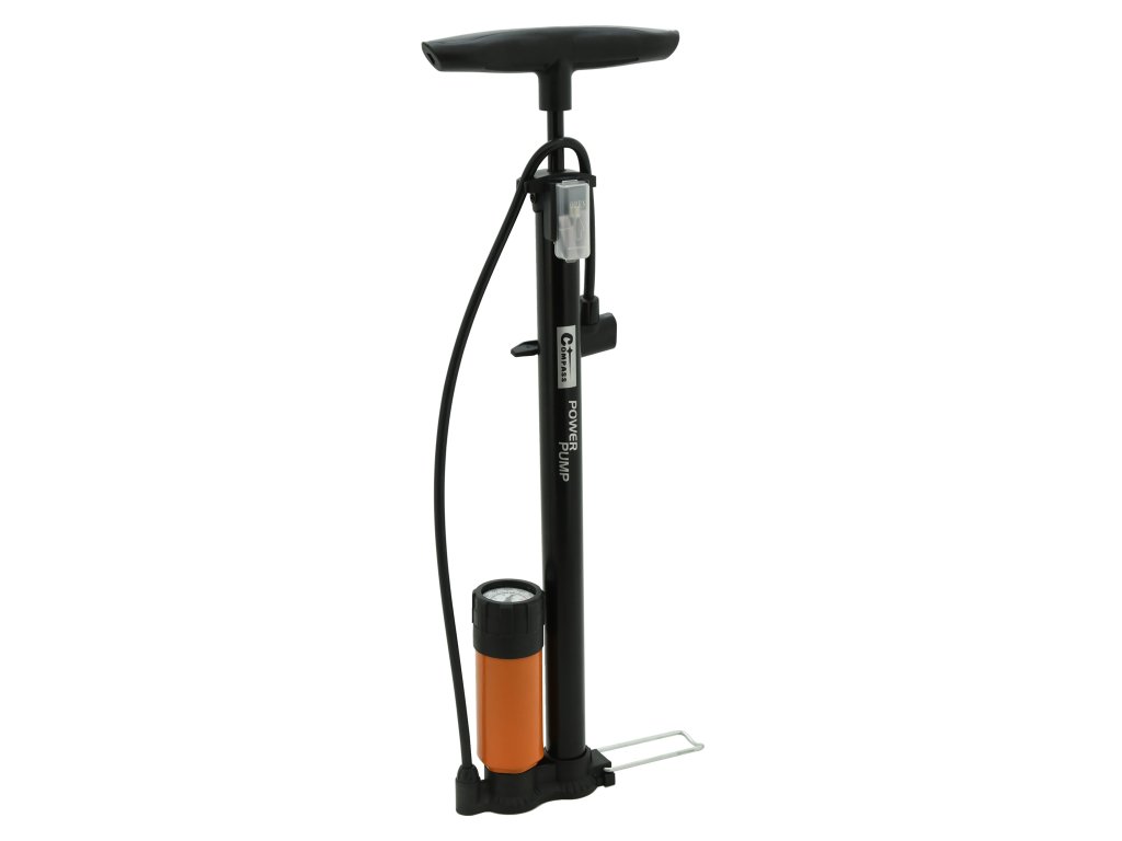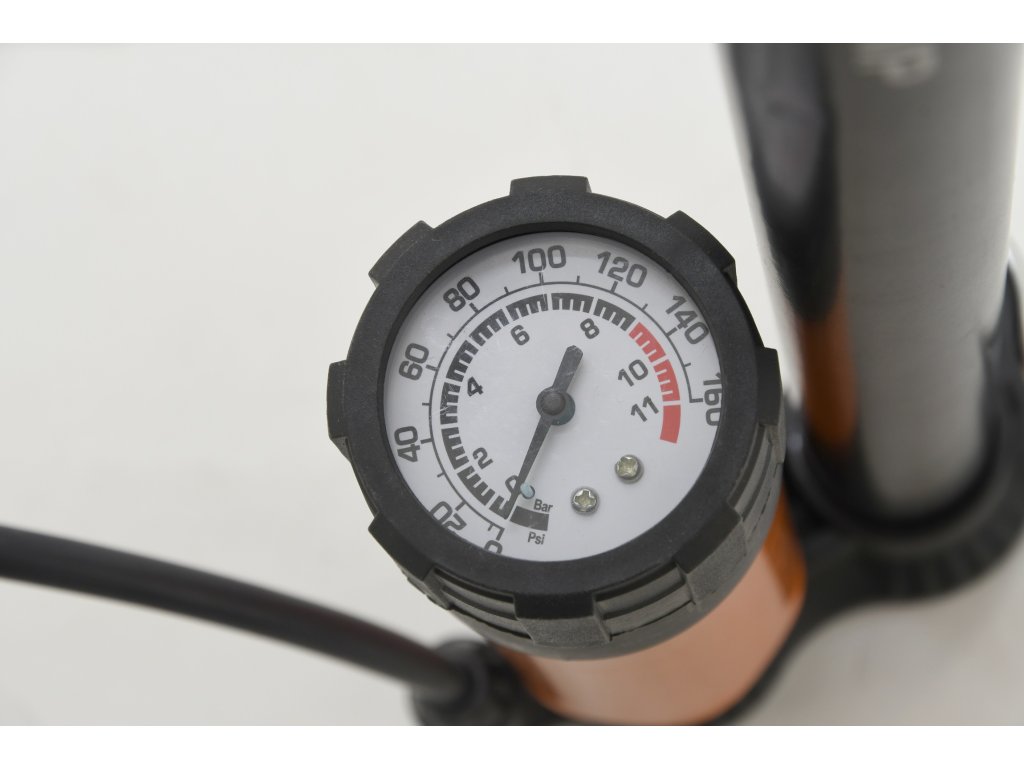 Ruční hustilka se zabudovaným měřičem tlaku, pro huštění pneumatik osobních automobilů i jízdních kol.