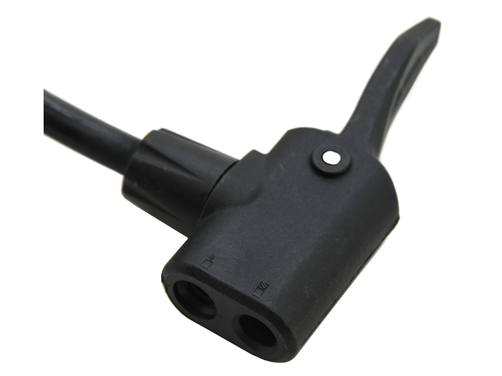 Díky dvojitému adaptéru na konci hadice lze hustilku použít jak na klasický automobilový ventilek, tak na cyklistický (galuskový ventilek).
