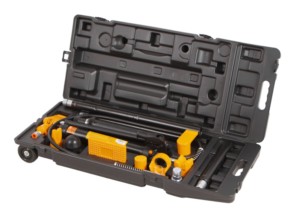 Tato přenosná sada uložená v plastovém kufru s kolečky se skládá z hydraulického válce a 13ti dílů příslušenství. Rozpínací síla pumpy je 10 tun a zdvih pístu 150 mm.