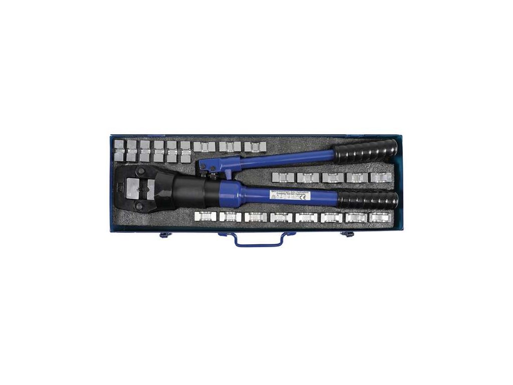 Krimpovací kleště BGS technic. Hydraulické, včetně 12 párů čelistí Hydraulické lisovací kleště pro krimpování 16 ÷ 400 mm2 Určeno pro lisování kabelových koncovek u hliníkových a měděných trubek a spojek na kabelech s velkým průřezem Čisté lisování pomocí šestihranu - zabraňuje vysokému přechodovému odporu Automatické nastavení přítlaku Lisovací rozsah (hliník) [2]: 35 ÷ 300 Lisovací rozsah (měď) [2]: 16 ÷ 400 Max. lisovací tlak [t]: 16 Dráha zdvihu [mm]: 24 Součásti dodávky hydraulických krimpovacích kleští BGS technic krimpovací kleště, hydraulické 12 vložek lisovacích čelistí použitelných pro [mm2]: 16, 25, 35, 50, 70, 95, 120, 150, 185, 240, 300, 400Doplňkové parametry