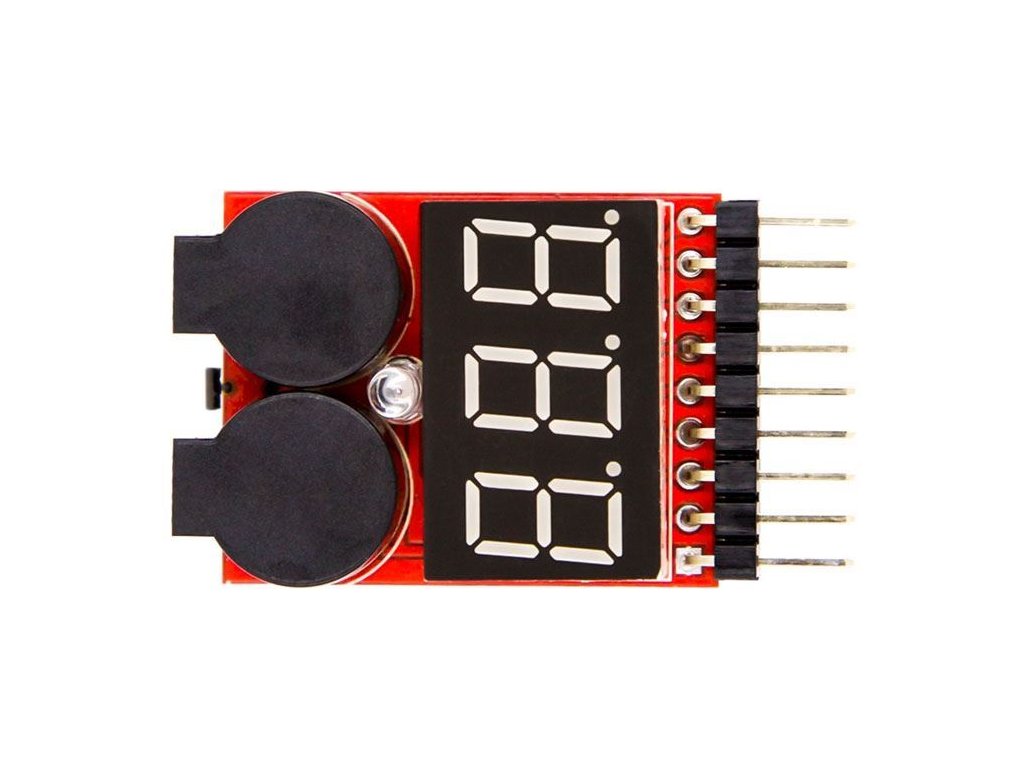 Jednoduchý tester 2-8 článků Li-Ion nebo Li-pol baterií. Ukazuje celkové napětí a také napětí jednotlivých článků. Zvukový alarm při prahové hodnotě napětí jednotlivých článků.**Specifikace:**