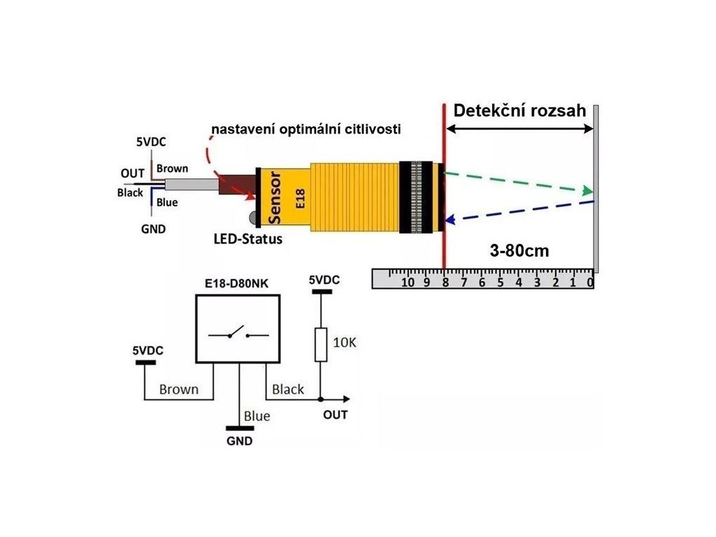Infračervená závora E18-D80NK 8-80cm /optická závora/ Infračervený senzor s nastavitelnou detekcí 3 - 80cm.Napájení: 5V