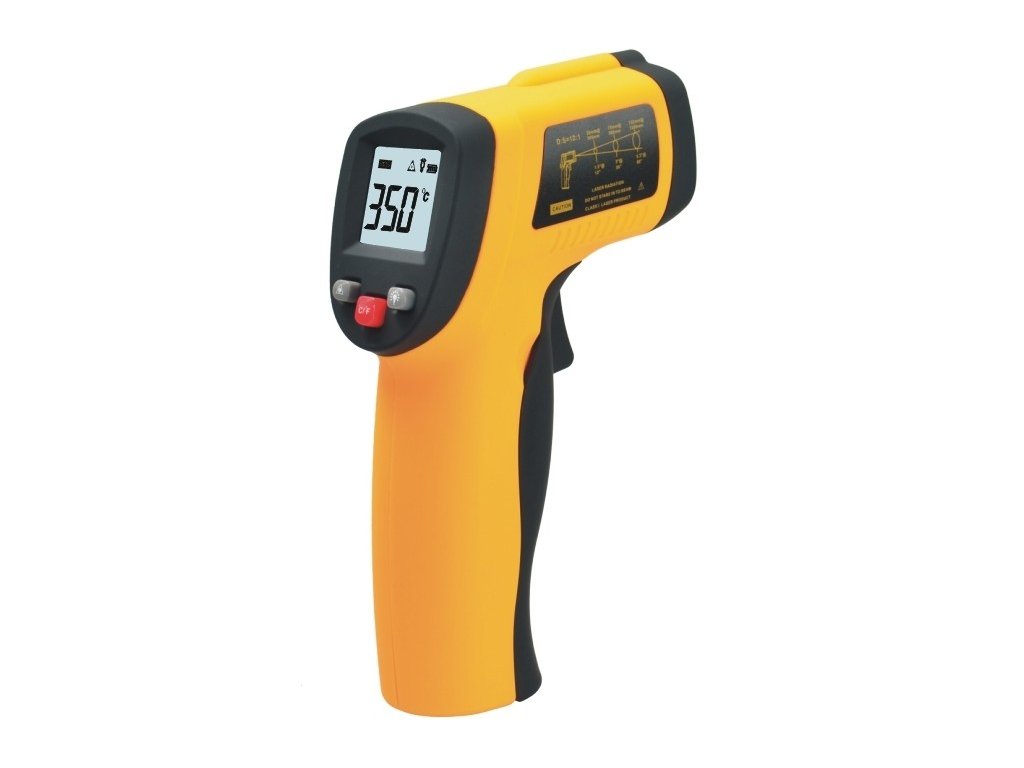 Infračervený laserový teploměr s bodovým laserovým zaměřovačem vysoké kvality slouží k bezdotykovému měření teploty. Teploměr snímá vyzařované tepelné vlnění, které vystupuje z povrchu materiálu. Laserový fixační paprsek (lze aktivovat/deaktivovat tlačítkem vlevo, ikona "laseru" na displeji) označuje červeným bodem střed snímané plochy a slouží ke snadnějšímu zaměření místa, kde je třeba změřit povrchovou teplotu. Změřená teplota je průměrná teplota snímané plochy. Čím menší je snímaná plocha, tím přesnější je změřená teplota. Průměr snímané plochy se zvětšuje se zvětšující vzdáleností v optickém poměru 12:1 (např. ve vzdálenosti od přístroje 120 mm je průměr snímané plochy 10 mm). Pravé tlačítko aktivuje/deaktivuje modré podsvícení displeje (ikona "žárovičky" na displeji). Červené tlačítko uprostřed na ovládacím panelu vzadu slouží k přepínání °C / F. Snímání je zahájeno stlačením spouště na rukojeti přístroje vpředu (na dispeji signalizováno ikonou SCAN) a je ukončeno jeho uvolněním, což je doprovázeno zvukovým signálem a ikonou HOLD na dispeji přístroje. Po 7 vteřinách od posledního použití se přístroj automaticky vypíná.