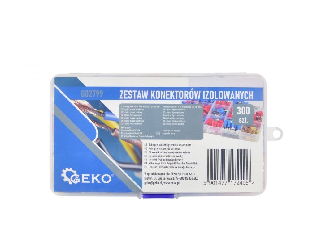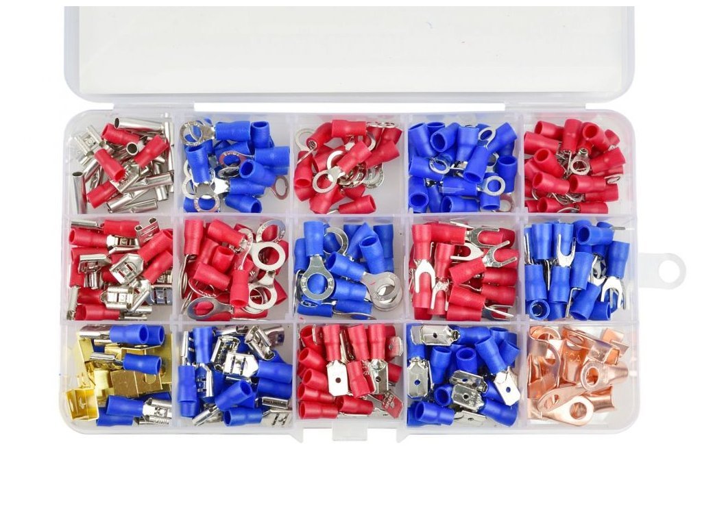 Sada izolovaných konektorů pro zakončení kabelů. Krimpovací konektory jsou zvláště užitečné pro vytváření kabelových koncovek na lankových drátech. Použití kabelových spojek zaručuje solidní údržbu všech volných vodičů v kabelech na jednom místě. To značně snižuje možnost zkratu. Izolované konektory z pocínované mědi a PVC izolace.