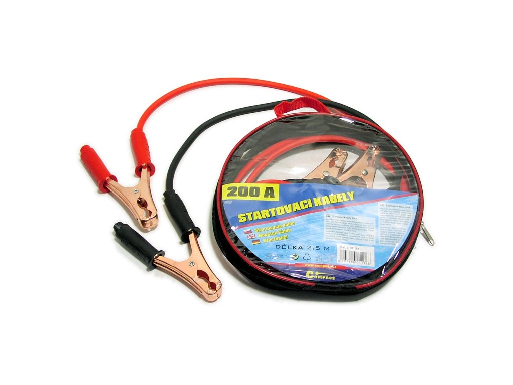 Kabel je vyroben ze 100% mědi. Neobsahuje žádné přísady jiných kovů, které snižují účinnost startovacích kabelů. Barevně označené startovací kabely se svorkami na akumulátor. Max. proud 200 ampér, délka 2,5 metru. Uzavíratelné balení "zipper bag", snadné uložení startovacích kabelů do praktického na zip uzavíratelného obalu.
