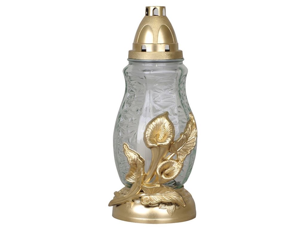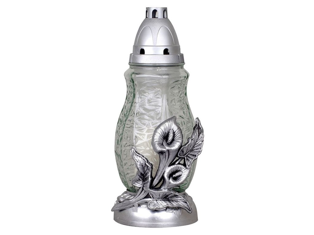 Klasický cenově dostupný kahanec na hrob s kalami z průhledného skla.