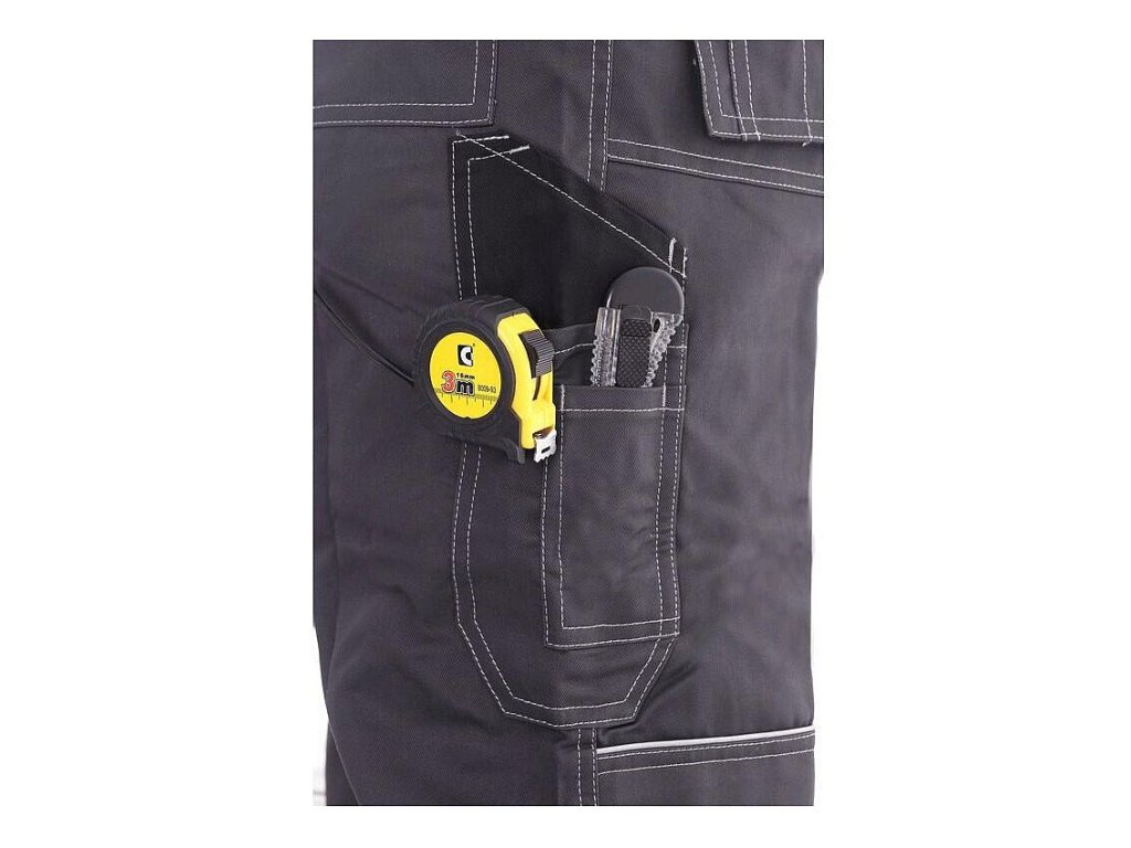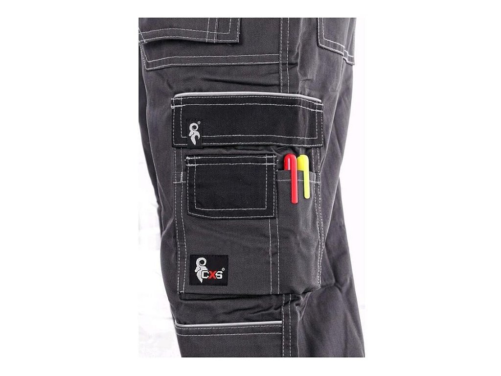 Pánské montérkové kalhoty s náprsenkou, náprsní kapsy s klopami, pas s poutky na opasek, vzadu do gumy, přední kapsy s poutky na nářadí, multifunkční kapsy na obou stranách, kolena zesílena 600D polyesterem s možností vložení kolenních výztuh, dvě zadní kapsy, jedna na suchý zip, šle s gumou vzadu, reflexní doplňky.