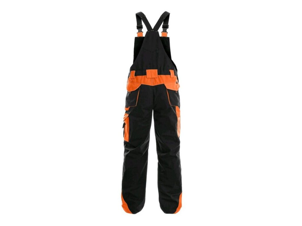Pánské montérkové kalhoty s náprsenkou, náprsní kapsa s klopou, pas s poutky na opasek, v zadní části guma s knoflíkem pro přizpůsobení velikosti, přední klínové kapsy, multifunkční kapsy na obou stranách, kolena zesílena materiálem 600D polyesterem s možností vložení kolenních výztuh, dvě zadní kapsy s klopami, šle s gumou vzadu, reflexní doplňky.