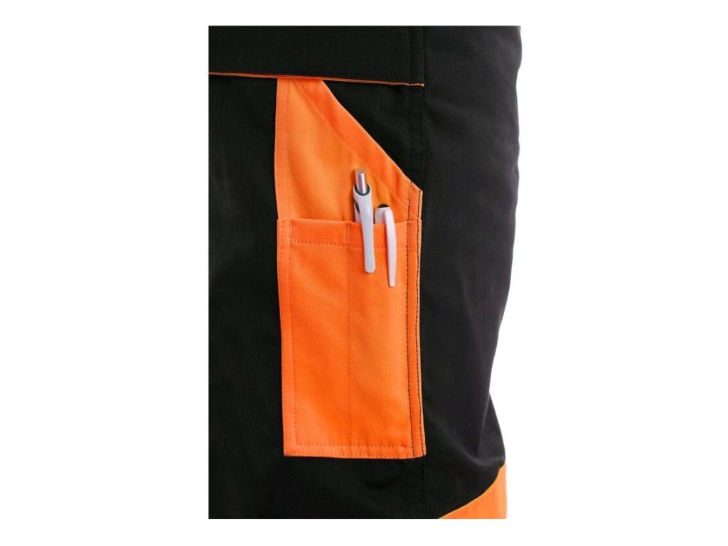 Pánské montérkové kalhoty s náprsenkou, náprsní kapsa s klopou, pas s poutky na opasek, v zadní části guma s knoflíkem pro přizpůsobení velikosti, přední klínové kapsy, multifunkční kapsy na obou stranách, kolena zesílena materiálem 600D polyesterem s možností vložení kolenních výztuh, dvě zadní kapsy s klopami, šle s gumou vzadu, reflexní doplňky.
