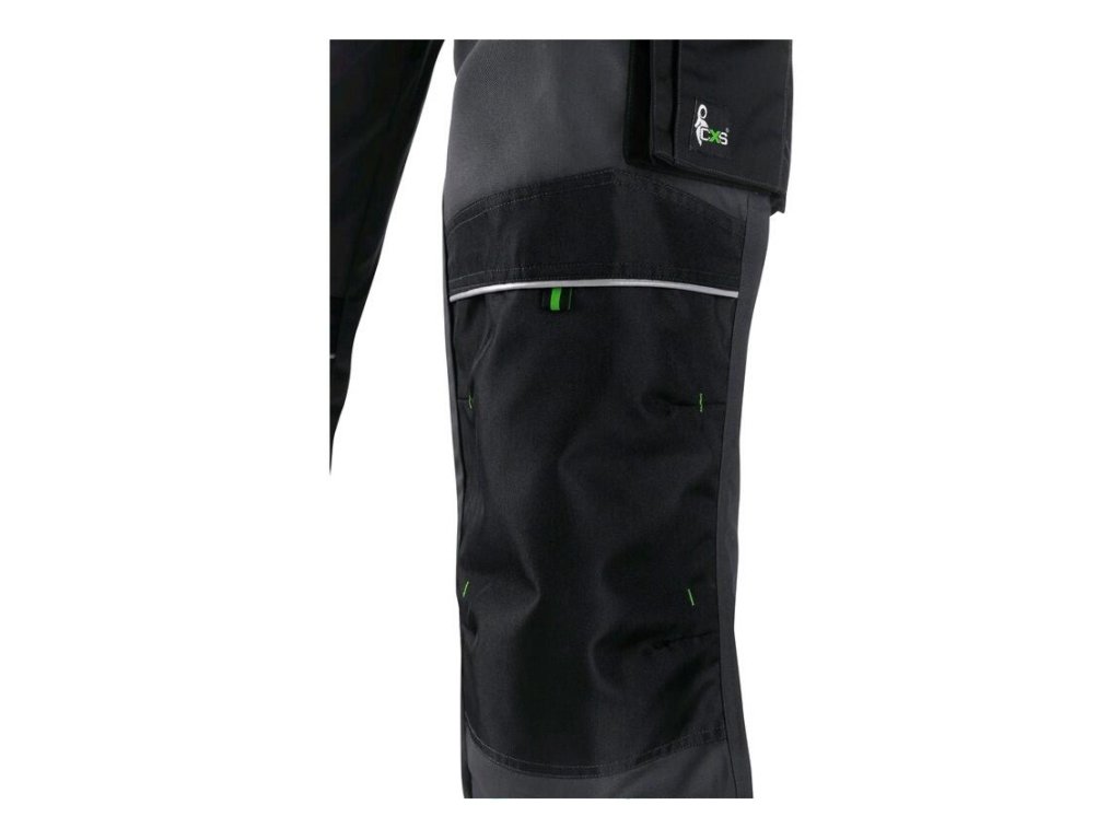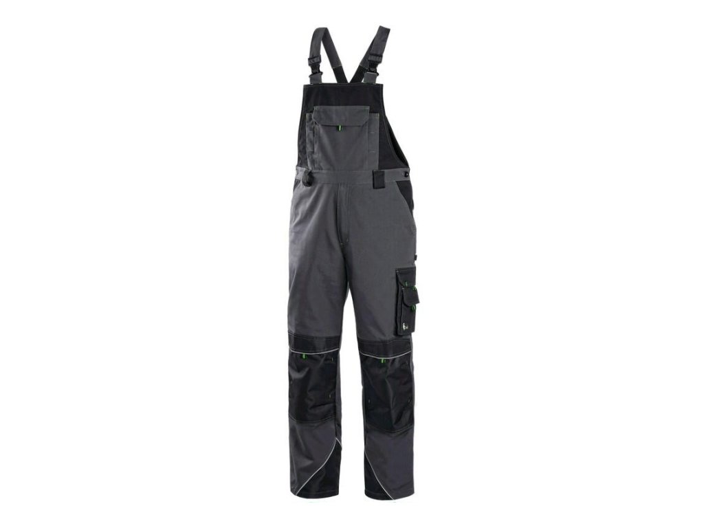 Pánské montérkové kalhoty s náprsenkou, náprsní kapsa s klopou, pas s poutky na opasek, v zadní části guma s knoflíkem pro přizpůsobení velikosti, přední klínové kapsy, multifunkční kapsy na obou stranách, kolena zesílena materiálem 600D polyester s možností vložení kolenních výztuh, dvě zadní kapsy s klopami, spodní část nohavic vyztužena materiálem 600D polyester, šle s gumou vzadu, reflexní doplňky.