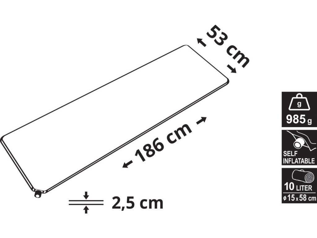 Barva karimatky je modrá, rozměry jsou 186 x 53 cm a tlouštka 2,5 cm. Balení má drobné rozměry 58 x 15 cm a váhu 985 g, takže není problém mít ho jako zavazadlo v přírodě vždy s sebou.