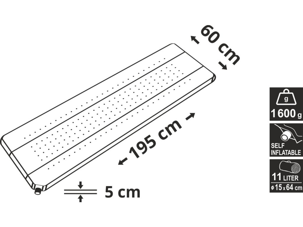 Barva karimatky je modrá s šedým pruhem. Díky délce 195 cm a šířce 60 cm je karimatka ideální i pro větší osoby. Tlouštka 6 cm navíc zaručuje vysoký komfort, při použití. Balení má drobné rozměry 64 x 15 cm a váhu 1600 g, není tedy problém mít ho vždy u sebe jako příruční zavazadlo v přírodě.