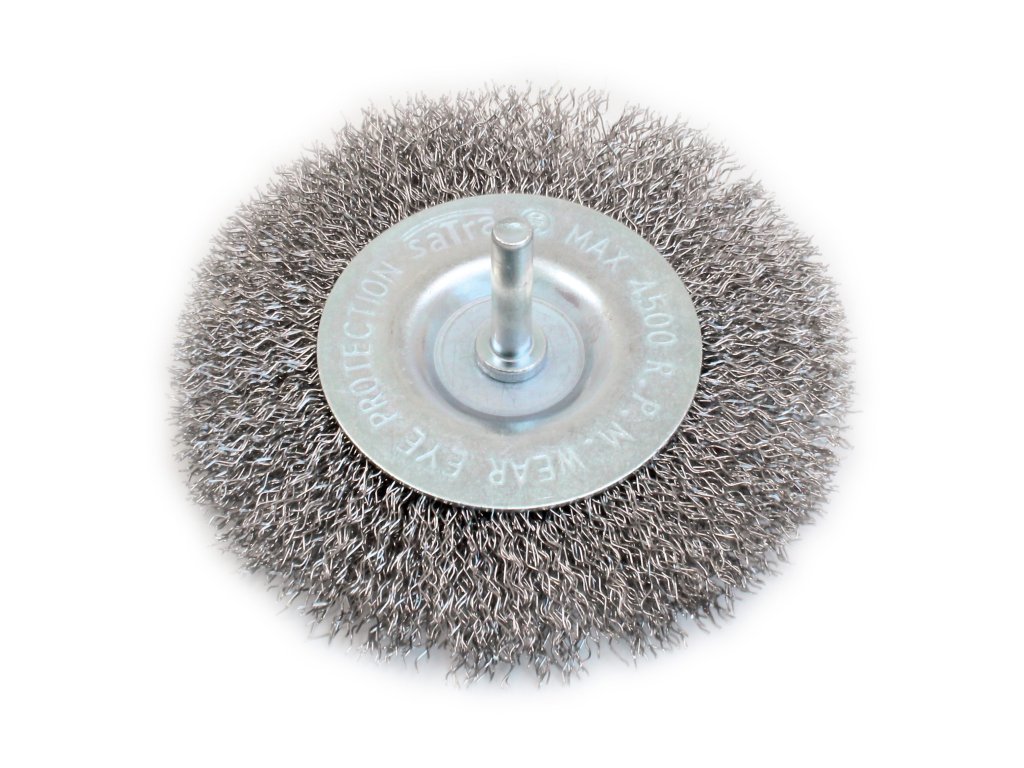 Kartáč okružní, vlnitý, ocelový 100x6 mm, se stopkou pro upnutí do vrtačky – SATRA S-100SB6.