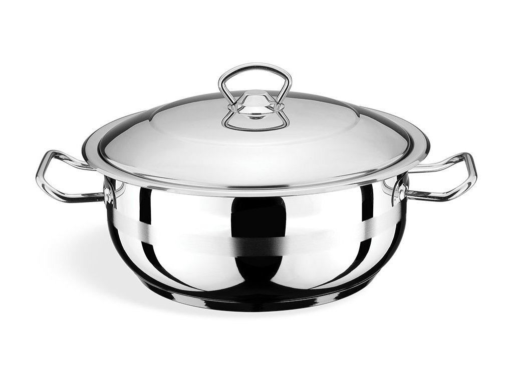 Celonerezový nízký hrnec s pokllicí se zesíleným třívrstvým akumulačním dnem.Materiál nerezová ocel 403 18/0, rukojeti 18/10.