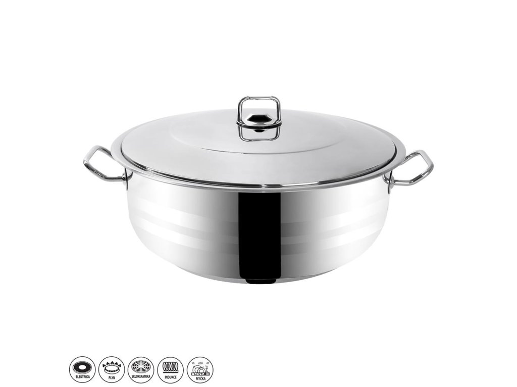 Velký nerezový nízký hrnec typu GASTRO s poklicí.Nerezová ocel 18/0, zesílené dvojité dno.