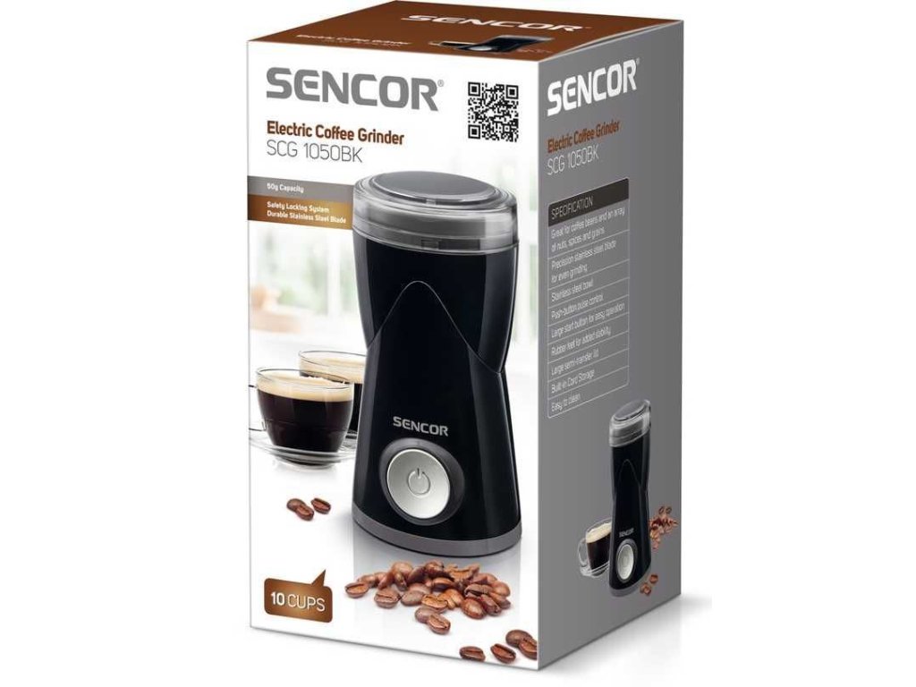 Kávomlýnek SCG 1050BK SENCOR Elektrický mlýnek na zrnkovou kávu, vhodný k mletí zrnkové kávy, ořechů, bylin, máku a koření, zásobník na maximálně 50 gramů kávových zrn vhodných k přípravě až 10 šálků kávy, Rovnoměrné mletí kávy díky speciálnímu nerezovému třištivému nožiDélka síťového kabelu: 90 cm, Rozměry (šířka x hloubka x výška): 104 x 104 x 182 mm, Hmotnost: 760 g, Napětí a kmitočet: 220-240 V, 50/60 HzBezpečnostní pojistka proti spuštění kávomlýnku bez uzávěru, Protiskluzové nožky pro snadné a stabilní mletí, Uskladnění síťového kabelu v podstavci, Příkon: 150 W, Hlučnost: max. 83dB,Nastavení jemnosti namleté kávy v závislosti na délce mletí, dlouhodobá životnost a jednoduchá údržba díky zásobníku a třištivému noži z nerezu, Velké bezpečnostní tlačítko zaručující snadnou obsluhuDoplňkové parametry