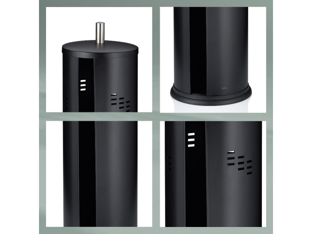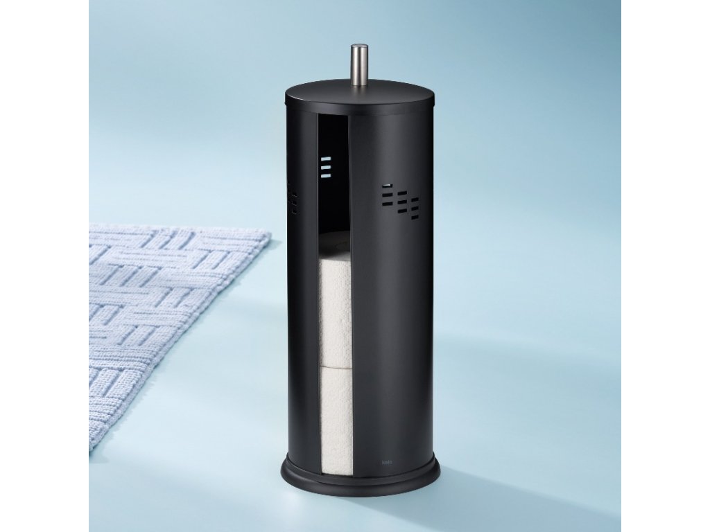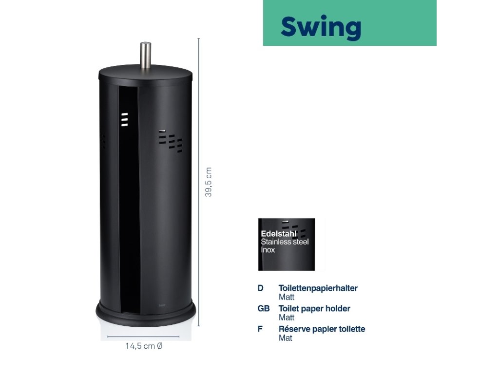 Zásobník na toaletní papír ze série SWING je vyroben z nerezové broušené nerezové oceli matného vzhledu a zdobený vzorem po celém obvodu otvorů. V zásobníku lze uložit až tři role toaletního papíru. Díky bočnímu otevírání nádoby lze každou roli snadno vyjmout nebo znovu naplnit. Nádoba na toaletní papír má víko, které ji chrání před nečistotami a vlhkostí. Gumový povlak na dně dodává nádobě potřebnou stabilitu a také ji chrání před poškrábáním.