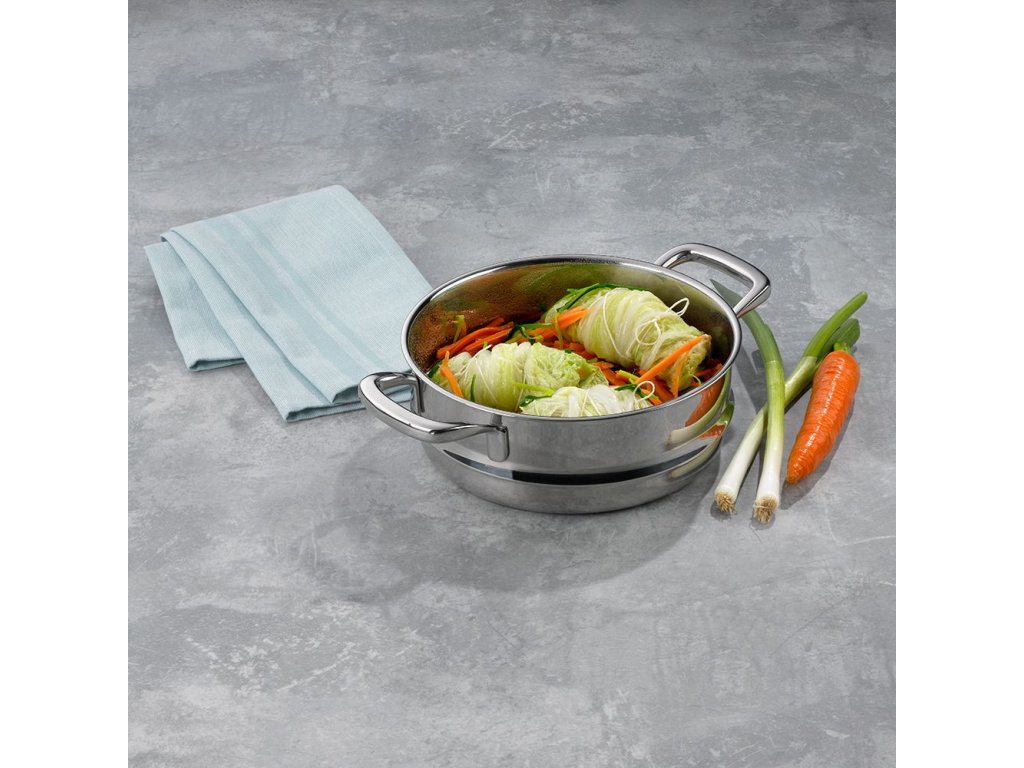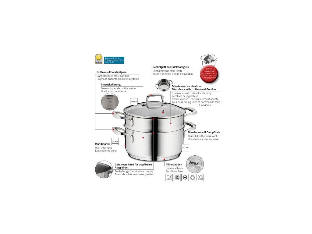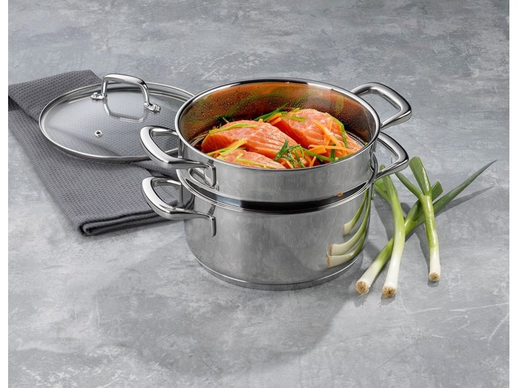 - ušlechtilá nerezová ocel v nejvyšší kvalitě 18/10- součástí je napařovací vložka pro vaření v páře, která zajistí šetrnou přípravu zeleniny, brambor, knedlíků, atd