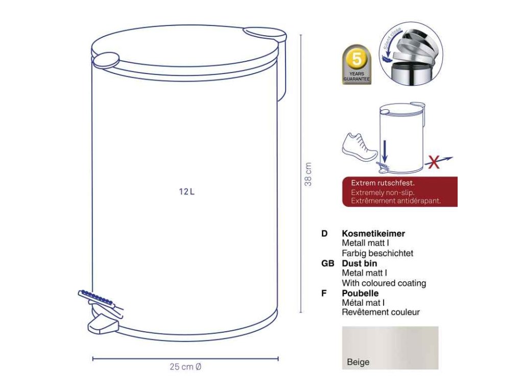 Pedálový koš Mats v béžové barvě s matnou povrchovou úpravou přináší nejen moderní design, ale i maximální praktičnost. Díky systému tichého zavírání se víko dovírá hladce a bez rušivého hluku. Protiskluzová základna zajišťuje stabilitu a bezpečné používání.