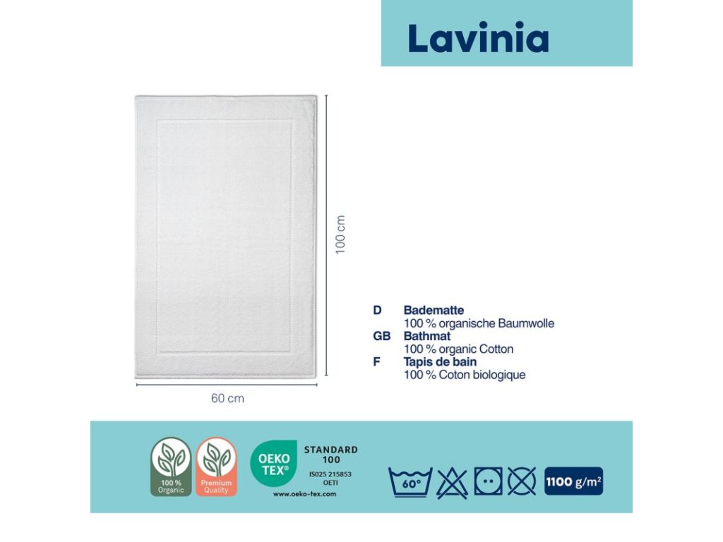 Představujeme Vám luxusní koupelnovou předložku LAVINIA od značky KELA. Tato předložka je vyrobena z 100% biobavlny, což zaručuje měkkost a příjemný pocit na dotek. S vysokou kvalitou materiálu o hmotnosti 1550 g/m2 poskytuje vynikající komfort a odolnost. LAVINIA je nejen funkční, ale také stylová. Snadná údržba je samozřejmostí.