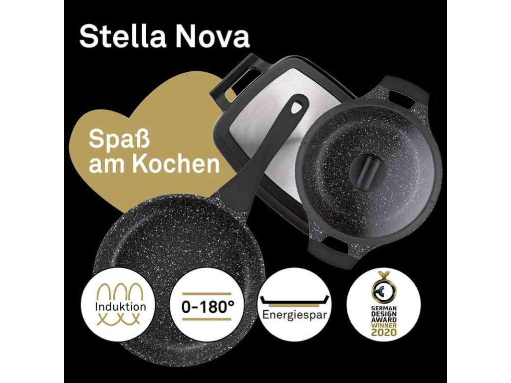 Při přípravě svých oblíbených pokrmů s hrnci a pánvemi Stella Nova zcela jednoduše zkombinujete přednosti dvou speciálních pánví. Vždy v závislosti na přání a na receptu je možné smažit na jedné a téže pánvi křupavé nebo vláčné pokrmy. Po osmažení při vysoké teplotě pokrm získá křupavou a chutnou krustu, ale přesto je možné ho snadno uvolnit od povrchu s nepřilnavou úpravou. To umožňuje několik tisíc mikro prohlubní ve struktuře (systém Oil- Control). Při smažení nebo dušení při nižších teplotách bude jídlo jemnější, ale bude mít stejně intenzivní chuť. V každém případě budete potřebovat jen malé množství tuku nebo oleje, neboť se pod pokrmem rozlije zcela rovnoměrně. Přichycení nebo dokonce připečení patří minulosti a čištění je naprosto jednoduché.
