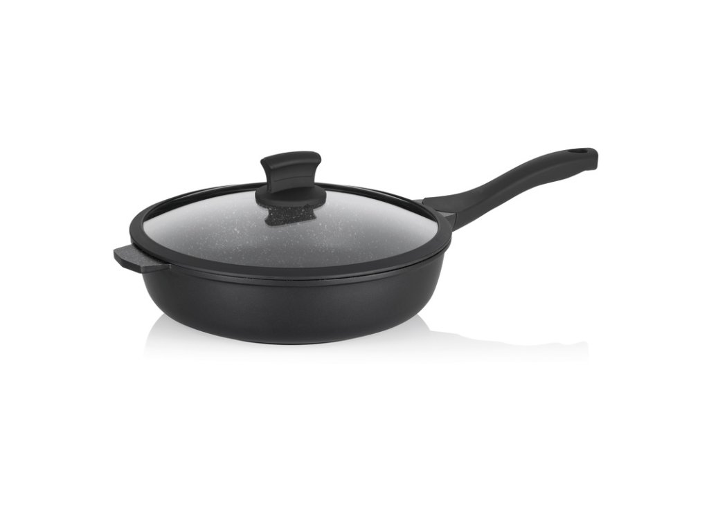 Dostatek místa díky zvýšenému okraji celkem 8 cm – pánev na guláš Stella Nova včetně skleněné poklice. Tato praktická pánev je vyrobena z litého hliníku s robustním nepřilnavým povrchem pro kuchyň šetřící tuk bez připalování. Výrobek je tepelně odolný až do 180° C. Speciální povrchová struktura umožňuje rovnoměrné a rozsáhlé rozložení oleje. Vhodné pro plynové, sklokeramické varné desky, elektrické sporáky a indukční sporáky. Průměr 28 cm, výška 8 cm. Hliník litý s nepřilnavým povrchem bakelitová rukojeť Soft Touch 28 cmFascinující výsledky vaření a smažení s intenzivní chutí.