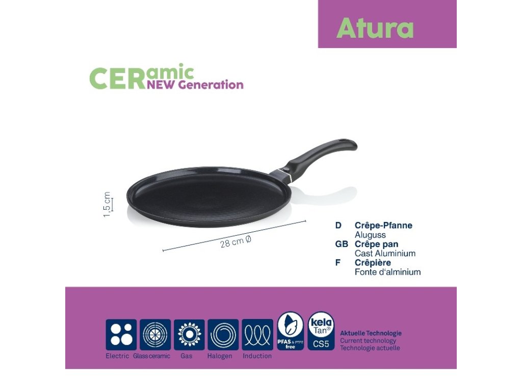 Vysoce kvalitní pánev na palačinky Atura s inovativním keramickým povrchem. Neobsahuje teflon!