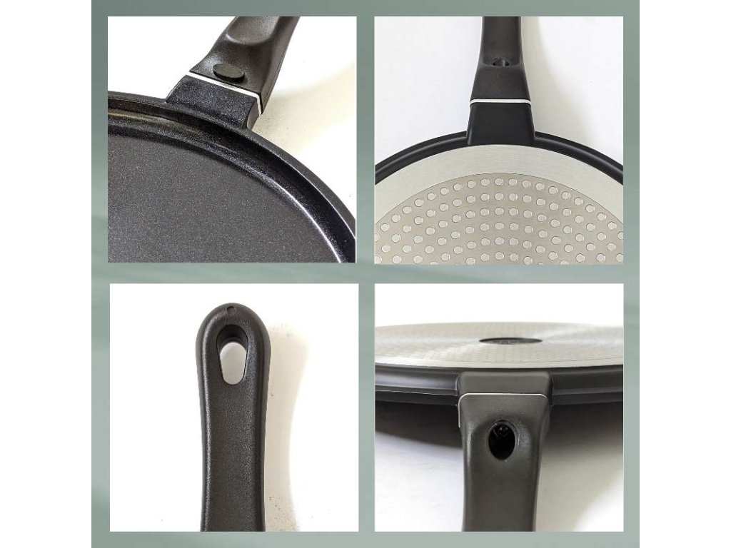 Objevte dokonalý doplněk do vaší kuchyně: tato palačinková pánev je vyrobená z odolného litého hliníku s pokročilým dvouvrstvým keramickým povrchem. Tato pánev zaujme nejen skvělými výsledky smažení, ale také svým složením – je zcela bez PFOA a PTFE.