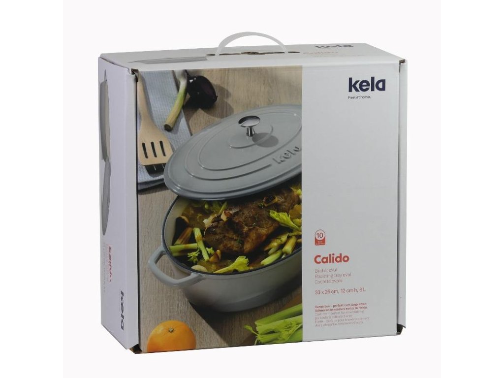 Ze série kela Calido: Oválný pekáč v šedé barvě s lesklým povrchem a víkem je dlouhý 33 cm, široký 26 cm a má objem 6,0 litrů. Celková délka včetně držadel je 42 cm. Tento šedý kastrol je vyroben z litiny a uvnitř je smaltován béžovou barvou. Pekáč je ideální pro opékání masa (do 300°C) a pro dušená jídla, která by se měla dusit ve vlastní šťávě po dlouhou dobu. Pekáč s poklicí je součástí rozsáhlého sortimentu nádobí!Smaltovaná litina světle šedá/béžová 33x26cm 12cm v, 6L