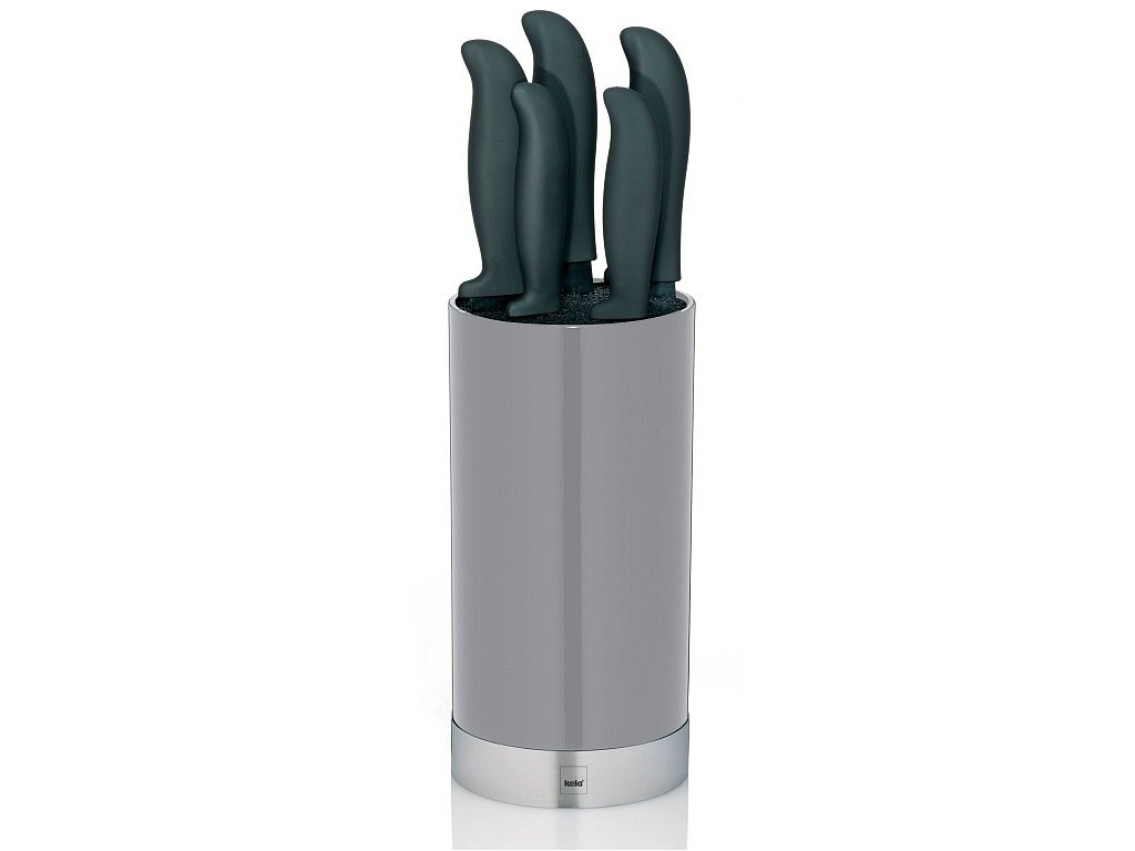 Vysoce kvalitní nože z oceli v černé barvě ve stojanu z PP plastu šedé barvy. Praktický vnitřek je tvořen tenkými plastovými tyčemi, které umožňují libovolné umístění nožů a zabraňují poškrábání ostří.Sada obsahuje: